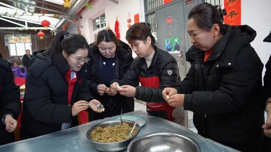 乡干部、村民、志愿者们一起擀皮、包饺子,大家忙得不亦乐乎,欢声笑语中大家交流着包饺子的技巧与心得,分享着生活中的点滴趣事,气氛温馨和谐,充满了浓郁的“家”的气息。不多时,一个个圆润饱满、洁白如玉的饺子便摆满了餐盘,这些饺子不仅包裹着美味的馅料,更凝聚着大家对美好生活的向往与祝福。随着一盘盘饺子下锅煮熟,香气四溢,大家围坐在一起,共同品尝着自己的劳动成果,纷纷竖起大拇指,赞叹不已。