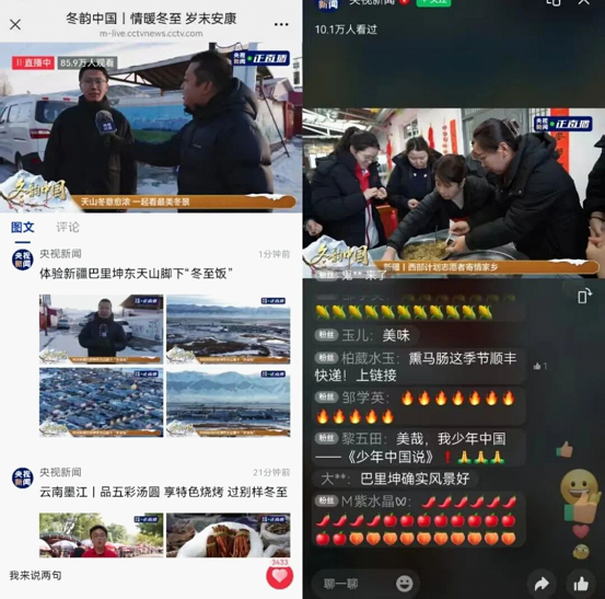 总台央视记者苏蒙说:“通过我们的镜头能够让全国的观众朋友们,能够实际地看到巴里坤特色冬至饭的制作过程,看到我们各族干部群众在一块其乐融融过咱们中华民族的传统节气,这个气氛是感受到了,而且非常非常得好,对我来说既是工作上非常好的体验,也是一次自己人生经历方面非常好的体验。”