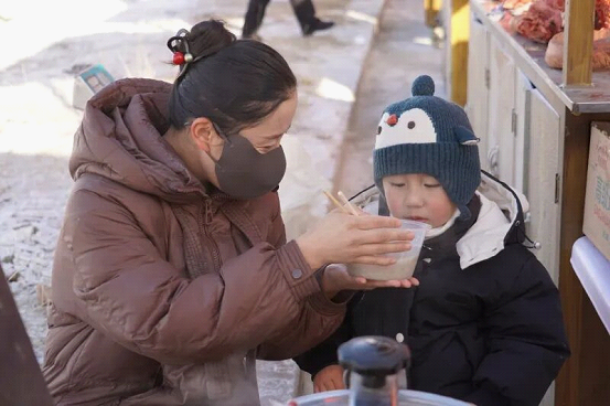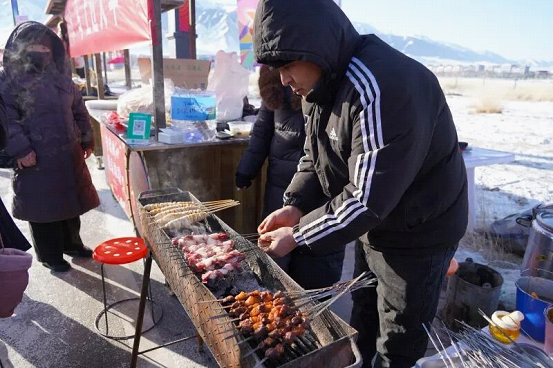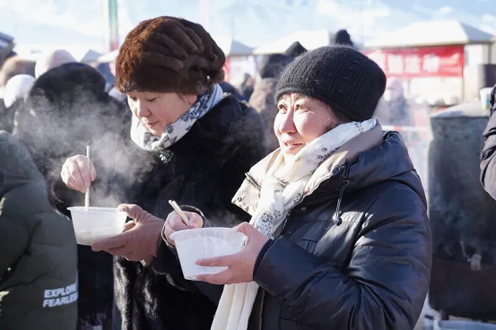 赛场外的年货集市同样人头攒动,香气四溢。地道的巴里坤烤肉、风味独特的马肠子等美食吸引游客驻足品尝;琳琅满目的玉石饰品、手工皮帽等特色商品供游人选购。尤其暖心的是,现场架起的大锅正热气腾腾地熬制着八宝粥和鲜美的羊肉汤,免费分发给八方来客,让人们在观赏精彩赛事的同时,也感受到巴里坤人民的热情好客。