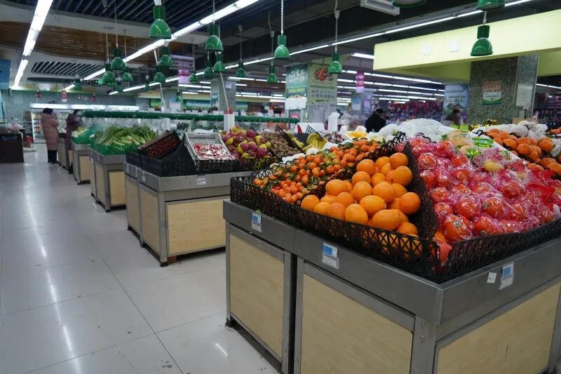 室外年货市集热闹非凡,室内商超同样洋溢着新年的喜庆氛围。在沃玛特购物中心,入口处就被造型各异的年货礼盒装点得喜气洋洋,坚果、糕点、零食、特色农产品等礼盒琳琅满目。新鲜的蔬菜水果上市、充足的米面粮油供应,让前来购物的居民可以放心选购。