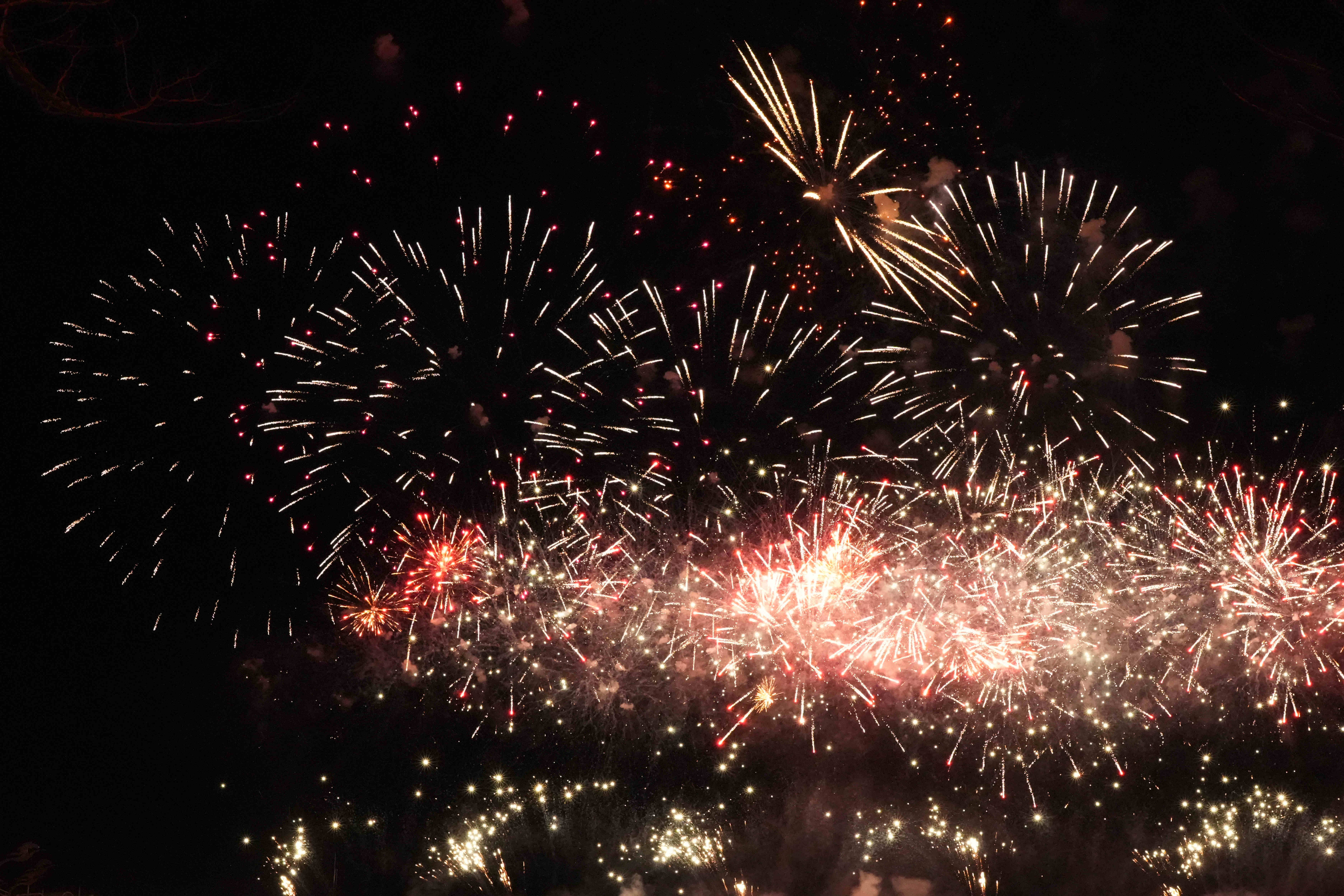 随后,烟花璀璨绽放,一簇簇礼花呼啸着冲上夜空,绽放出绚丽的光芒。