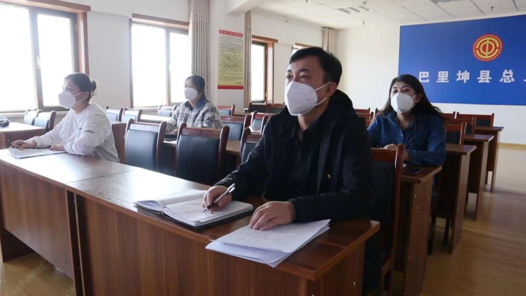 10月31日上午,在巴里坤县总工会五楼会议室里,县总工会党组副书记、工会主席努尔别克·霍加肯与干部们认真学习党的二十大精神。