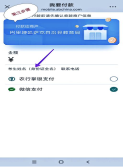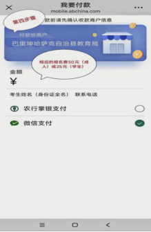 (二)缴费。测试费每人次标准为50元,在校学生凭学生证原件减半缴费(测试时需提交身份证、学生证复印件),网上报名成功的考生,同时扫以下二维码上缴测试报名费,按照以下缴费流程上的步骤图示认真操作上缴报名费,缴费时务必备注考生姓名(身份证全名)及联系电话,如考生没有填写备注相关信息,取消当次测试资格并无法退回报名费。