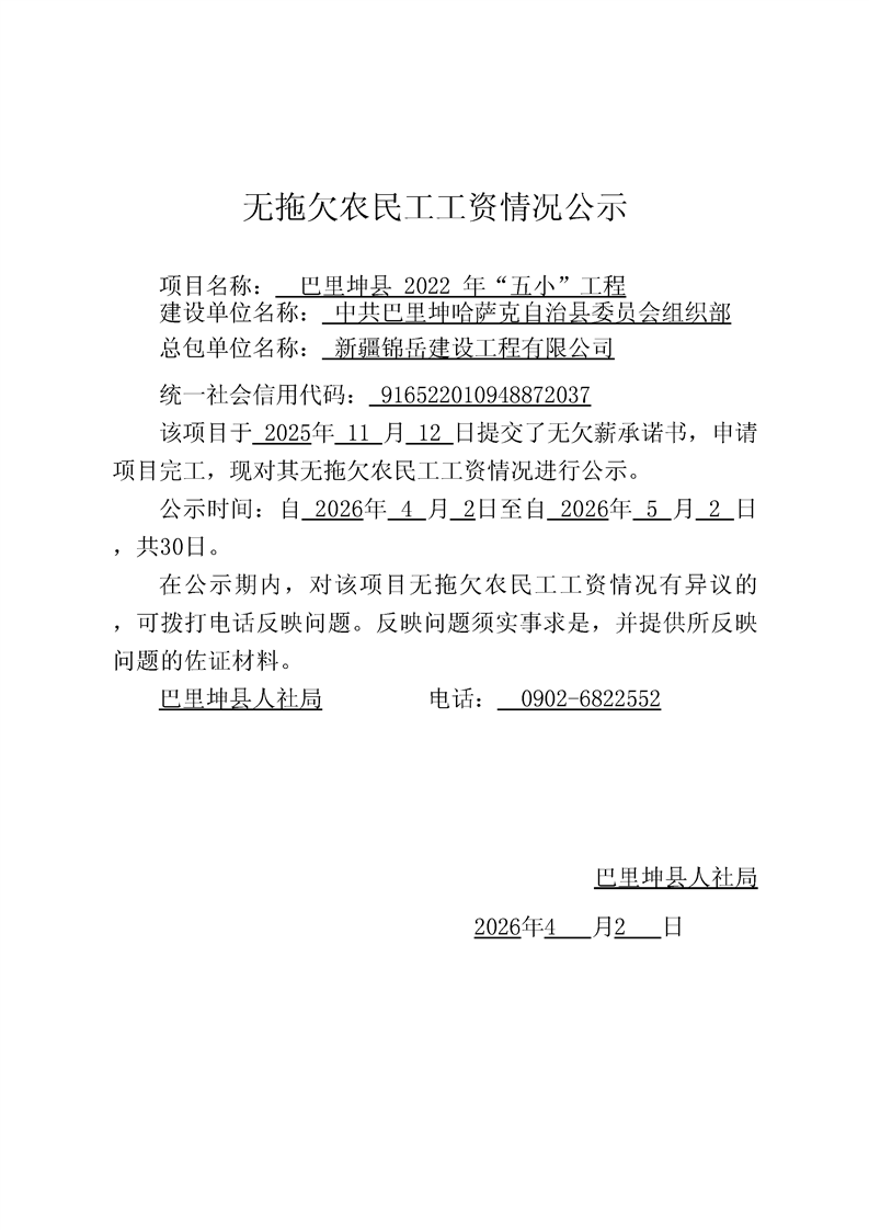 巴里坤县 2022 年“五小”工程无拖欠农民工工资情况公示