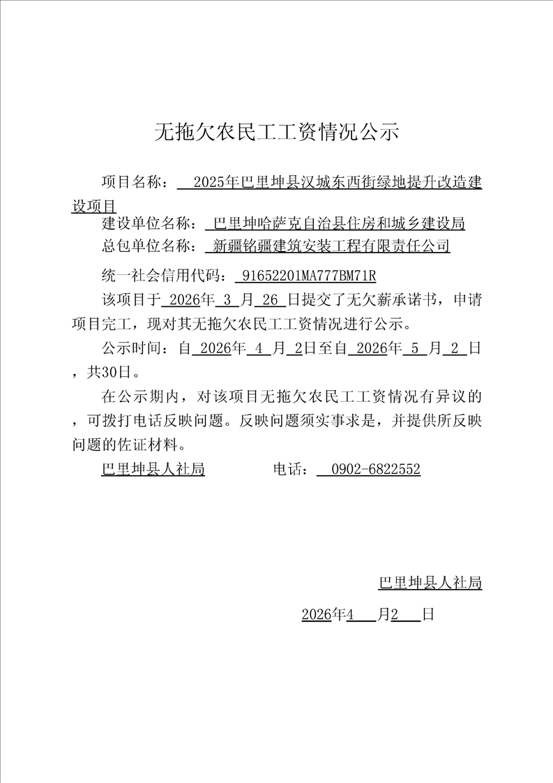 2025年巴里坤汉城东西街绿地提升改造项目无拖欠农民工工资情况公示